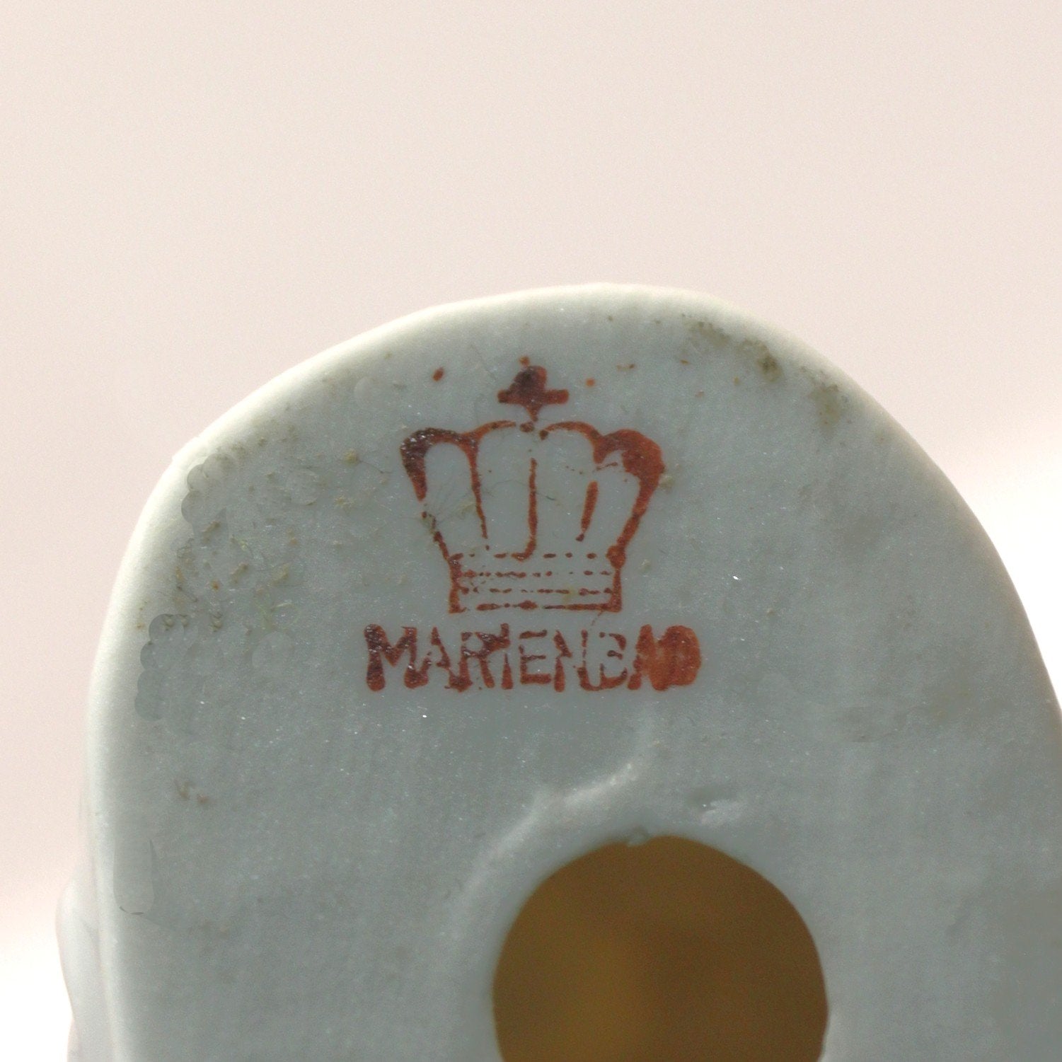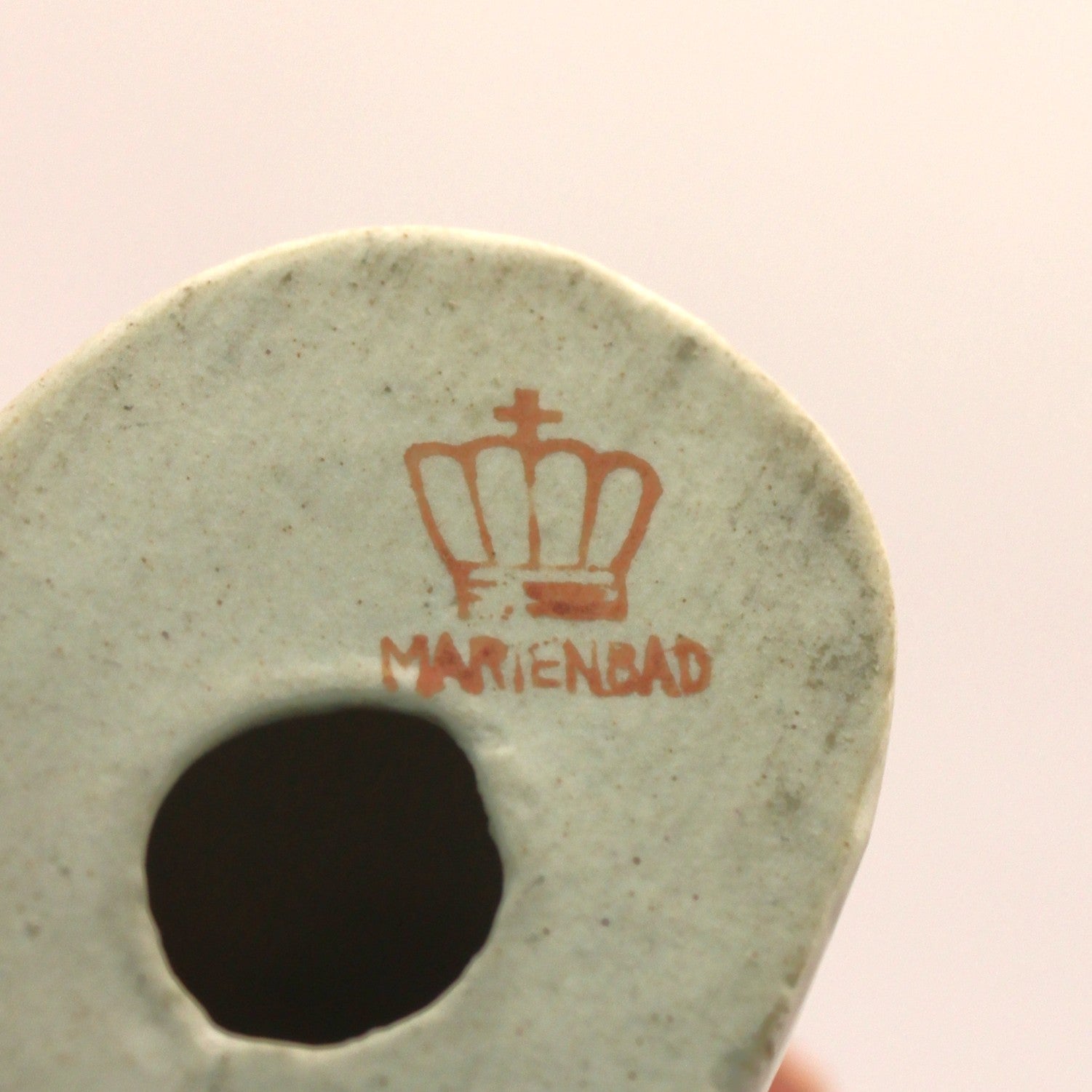 La policromía, aplicada con sobriedad y gusto, alterna tonos pasteles con detalles más vivos —como el rojo de la flor o los acentos en verde y negro—, logrando un equilibrio visual propio de la tradición decorativa bohemia. La marca en la base, con corona y la inscripción Marienbad, remite a la producción orientada al turismo cultural de esta célebre ciudad balneario, particularmente activa entre fines del siglo XIX y mediados del XX.