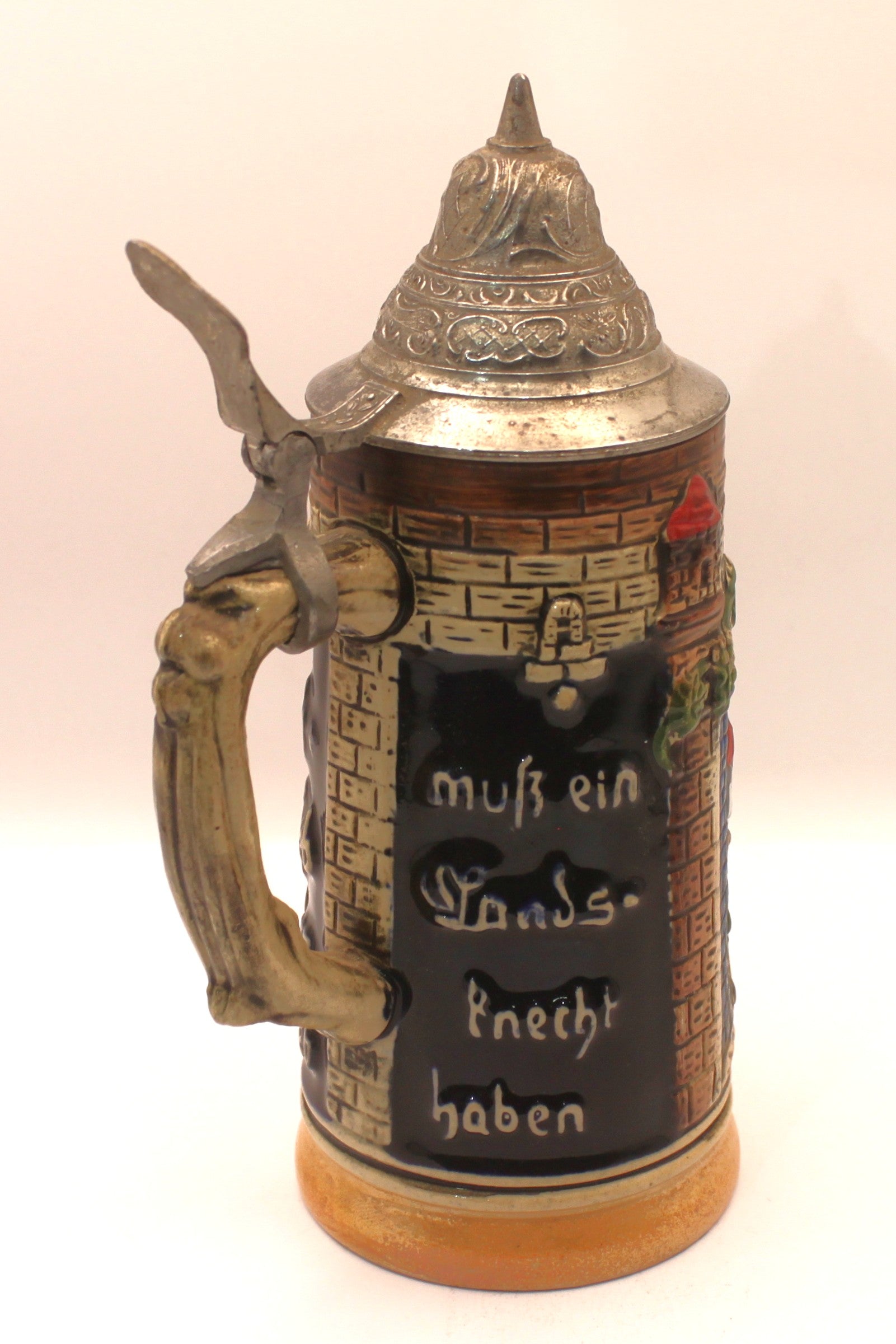 Simpática jarra cervecera alemana decorada con imágenes tradicionales. Fabricada a mano por Egon Bay entre los años setenta y ochenta, mide 19 x 8 x 11 centímetros y cuenta con su tapa en metal. Pieza interesante, ideal para coleccionistas.
