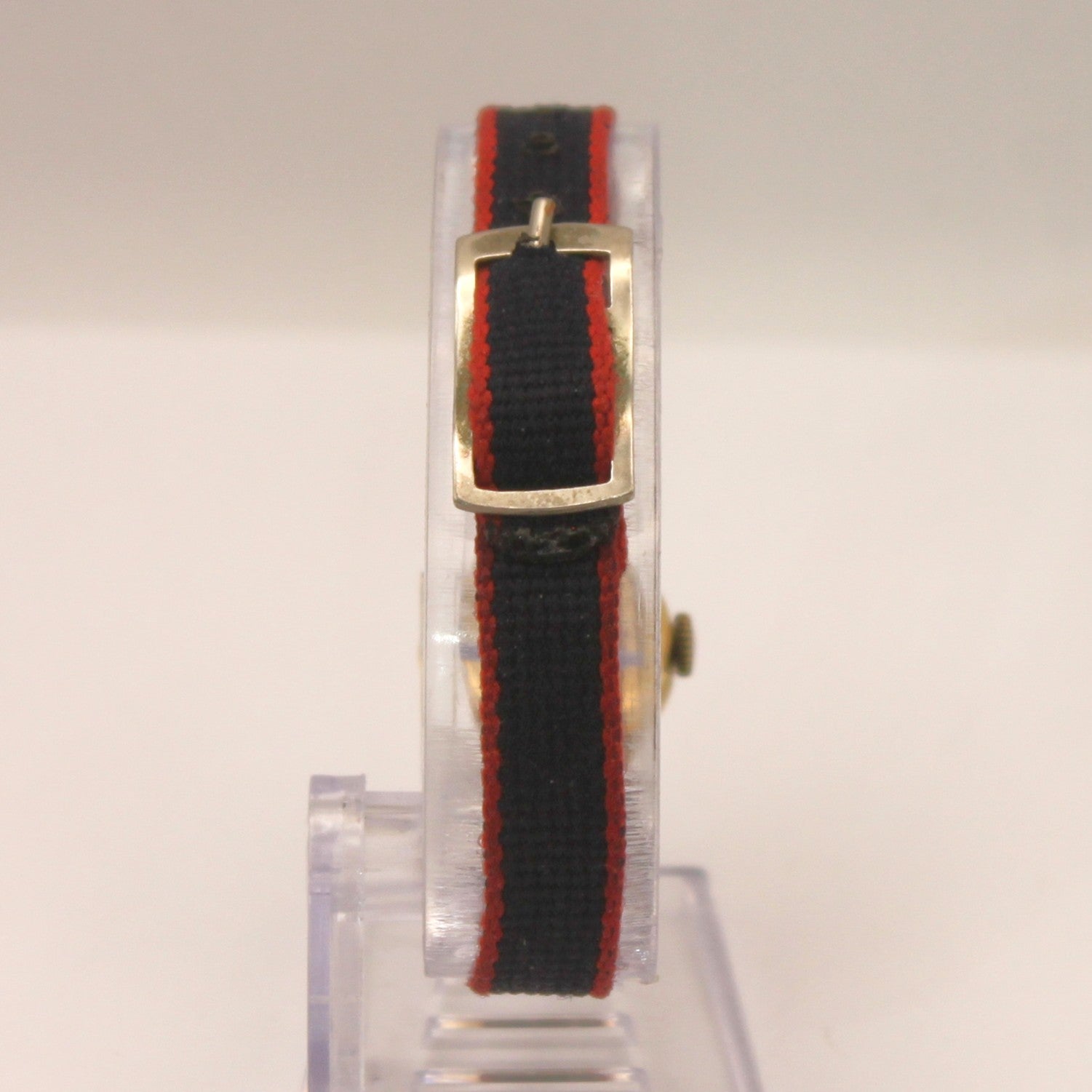 Simpático reloj de pulsera Renis, de mecanismo a cuerda y funcional al día de hoy, hecho en oro de 18 quilates; su correa no es original. Por su pequeño tamaño, es ideal para damas. Presenta una quebradura lateral en su flexo a las 3:30 horas, así como una mancha de prueba por ácido en el oro de su tapa posterior. Pieza de buen gusto, ideal para coleccionistas.