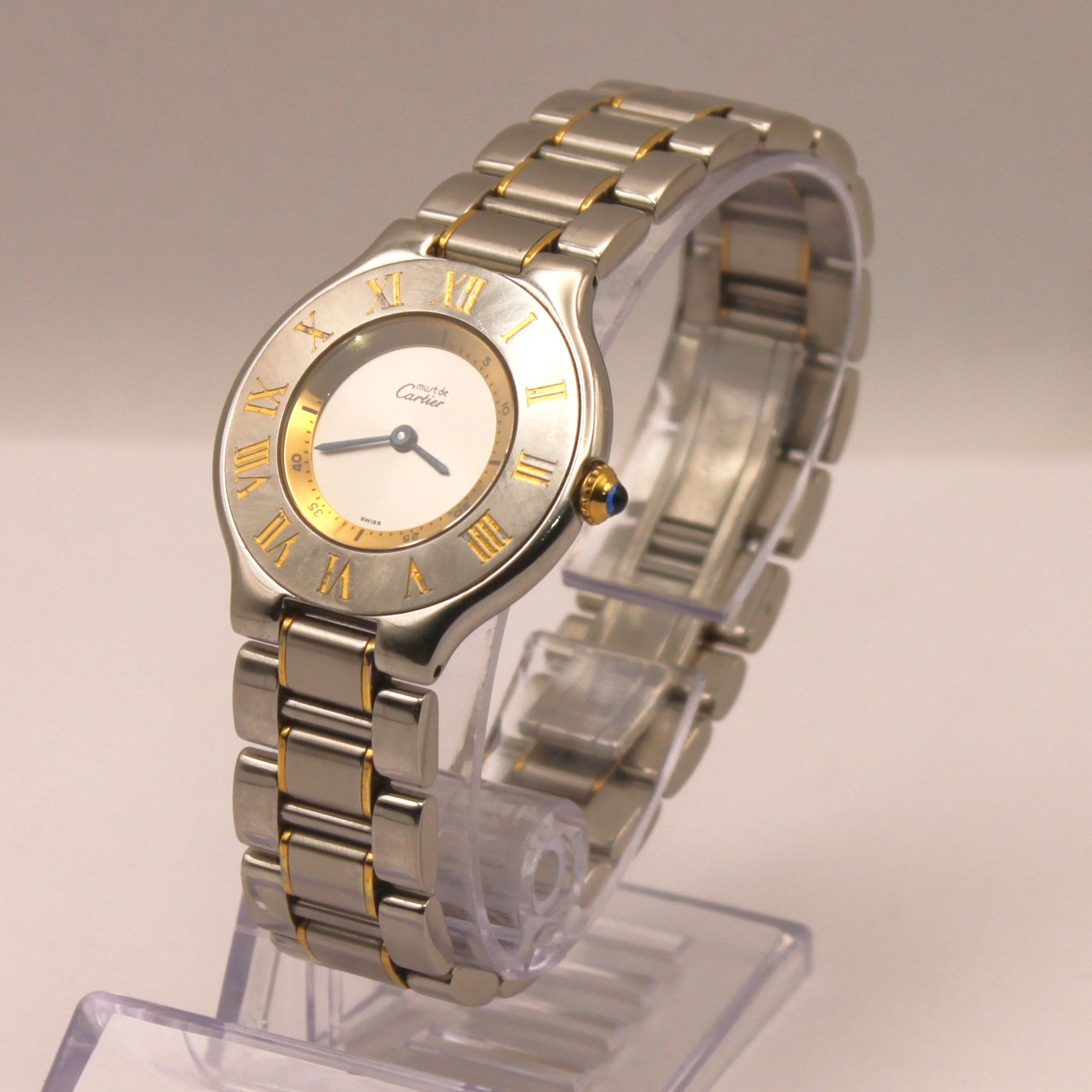 Hermoso reloj de pulseraCartier, serie Must, modelo 21, de mecanismoa cuarzoyfuncionalal día de hoy, hecho enacero inoxidable. Pieza de lujo, ideal para coleccionistas y aficionados a esta marca.