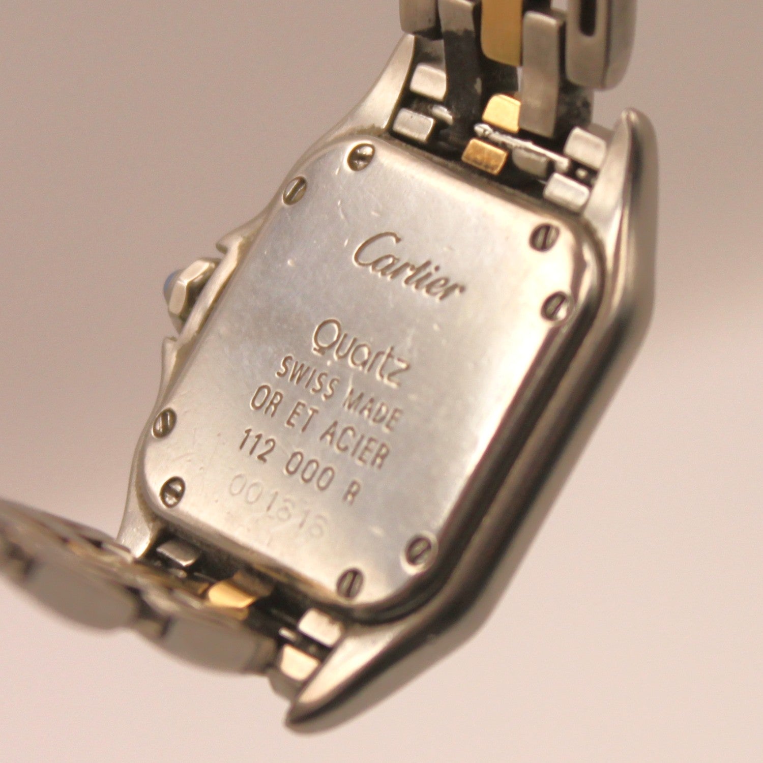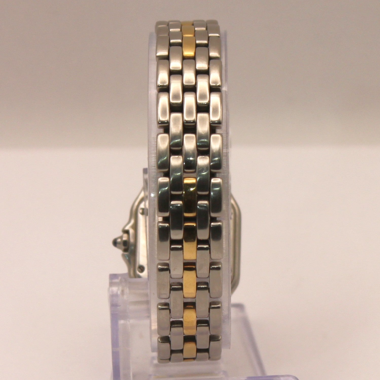 Hermoso reloj de pulseraCartier, modelo Panthère, de mecanismoa cuarzoyfuncionalal día de hoy, hecho enacero inoxidable con detalles en oro de 18 quilates. Presenta desgaste por antigüedad. Por su pequeño tamaño, es ideal para damas. Pieza de lujo, ideal para coleccionistas y aficionados a esta marca.