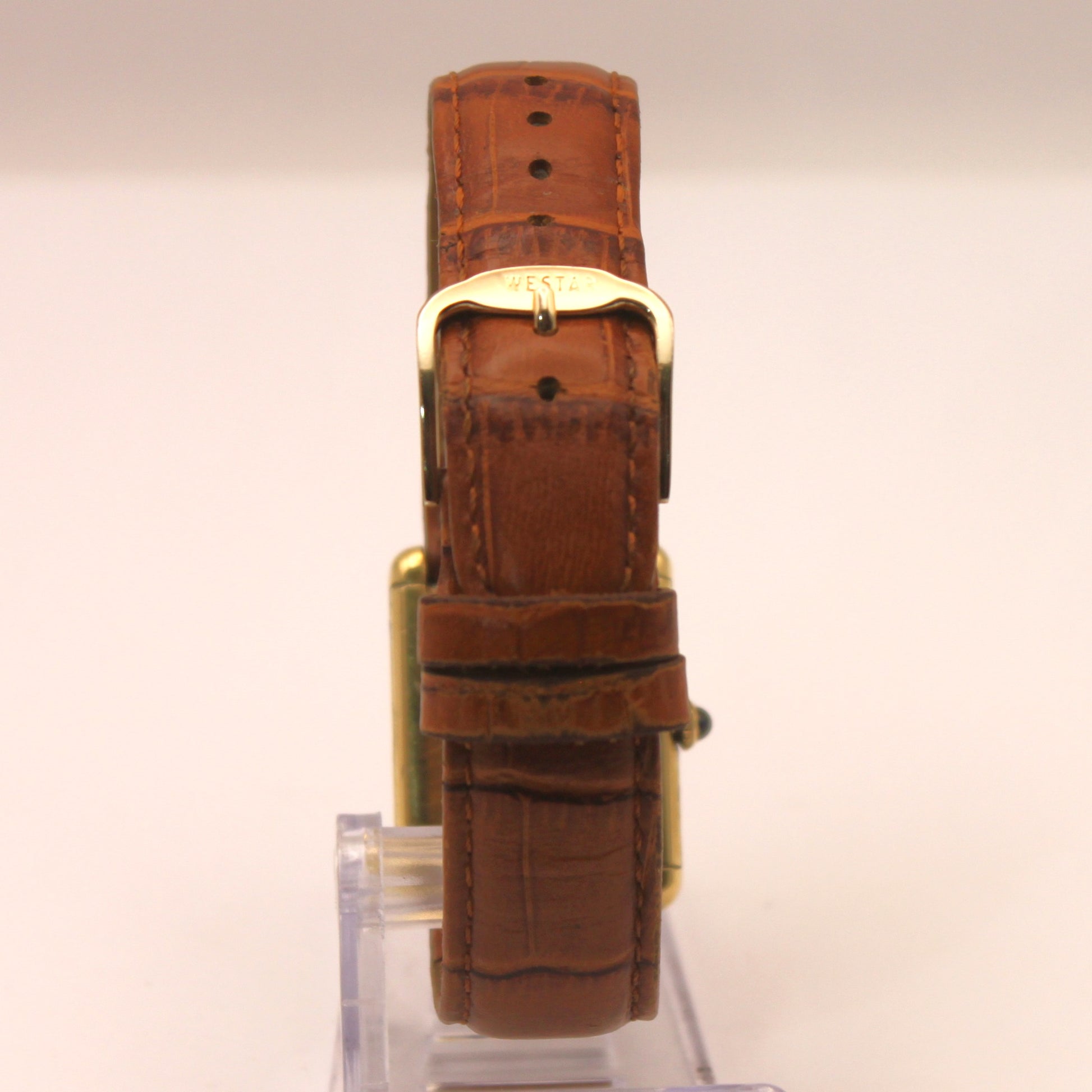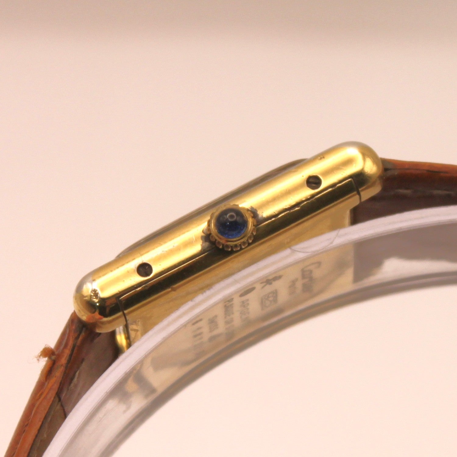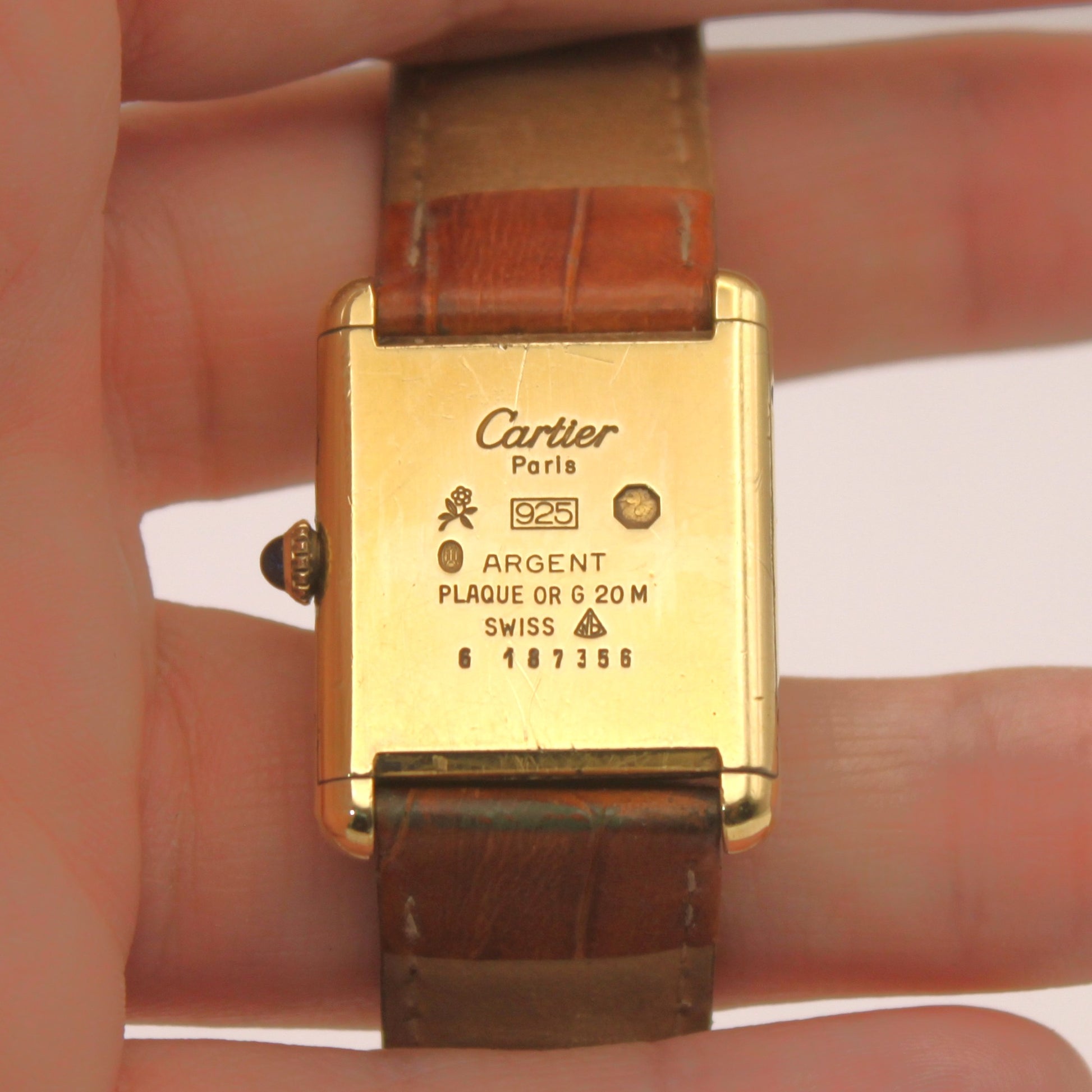 Hermoso reloj de pulseraCartier, serie Must, modelo Tank, de mecanismoa cuerda yfuncionalal día de hoy, hecho envermeil: base de plata bañada en oro de 18 quilates; su correa no es la original. El presente ejemplar es conocido como Bordeaux Dial por el color de su cara. Pieza de lujo, ideal para coleccionistas y aficionados a esta marca.